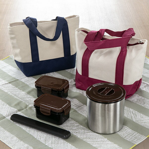 カジュアルなランチバッグ、箸(ケース付き)、ご飯容器(保温ジャー)、おかず容器がセットになったランチボックスセットです。